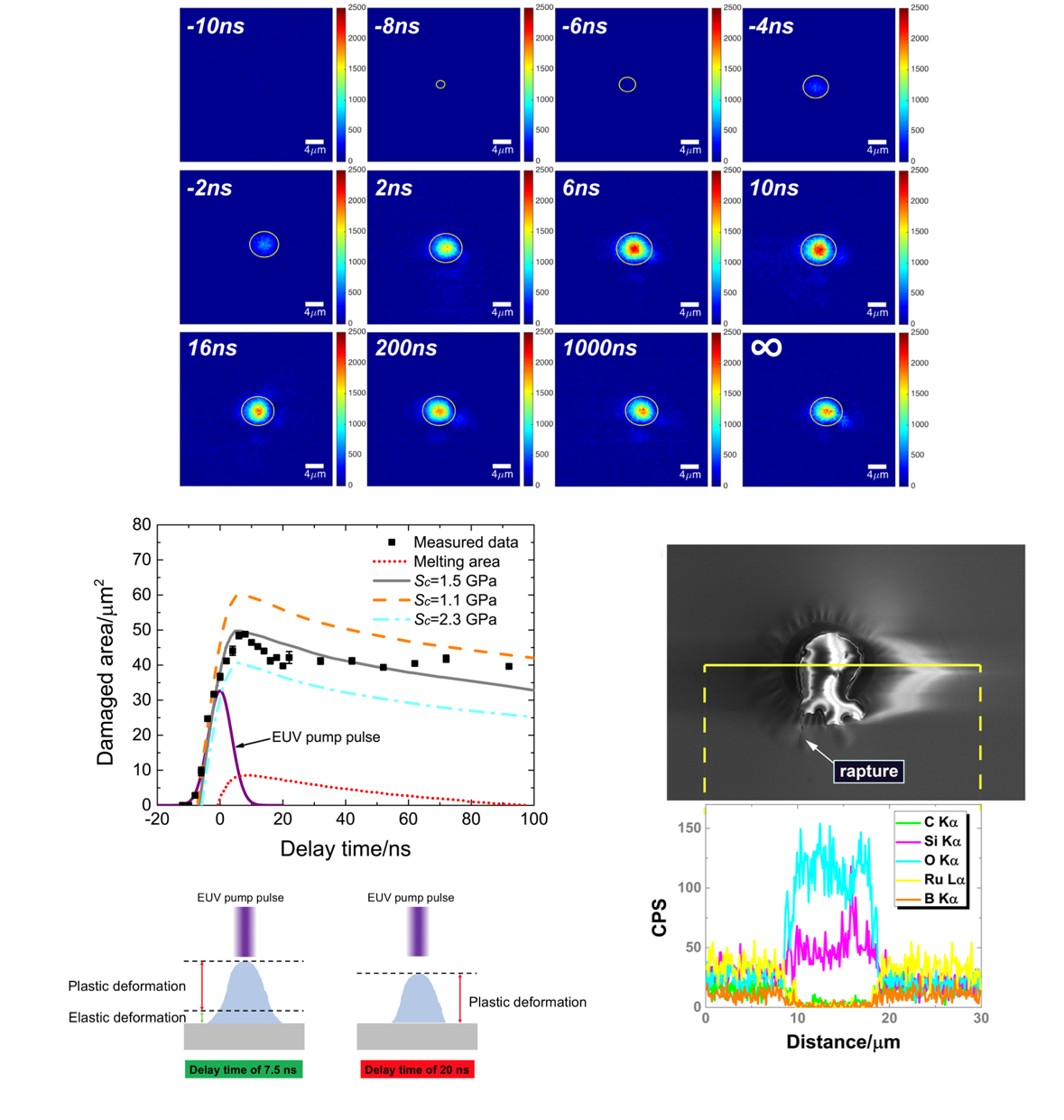 針對上述科學問題,該研究團隊以納秒極紫外光為泵浦光,飛秒光學激光為探測光,在解決了泵浦光的時序控制和雜散光抑制等關鍵技術難題下,研制成功了高時間和空間分辨的納秒極紫外泵浦-飛秒紅外激光探測成像損傷測試系統(圖1),可實現對納秒極紫外輻照薄膜反射鏡的動態損傷形貌開展高時間分辨成像探測。面向我國硬X射線FEL裝置(SHINE)FEL-I光束線的應用需求,研究團隊設計制備了B4C/Ru雙層膜反射鏡,并利用上述泵浦-探測系統研究了B4C/Ru雙層膜極紫外損傷動力學過程(圖2)。泵浦-探測實驗表明B4C/Ru雙層膜在極紫外光輻照下產生了凸起狀損傷,并且在輻照過程中損傷區迅速增加后出現了部分恢復現象。結合溫度場和應力場理論模擬與實驗測試,發現在EUV輻照下Ru薄膜內部產生的壓應力導致雙層膜從基板表面脫離并形成凸起狀損傷。該研究通過建立熱應力損傷物理模型解釋了B4C/Ru雙層膜損傷區部分自行恢復的現象。