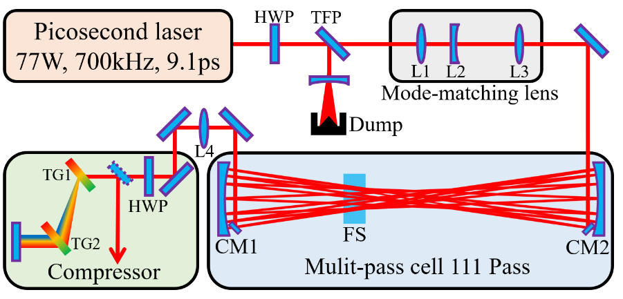 針對上述問題,研究人員利用非線性后壓縮的方式實現了高功率激光脈寬從皮秒到飛秒的跨越。研究人員先利用窄帶的、大發射截面的激光介質(Nd:YVO4)實現皮秒激光高效直接放大(無需采用CPA技術),進一步采用MPC非線性后壓縮的手段實現從“皮秒”到“飛秒”的轉化。通過合理設計MPC參數,采用單級MPC裝置將皮秒激光的脈寬從9.13 ps壓縮至477 fs,系統總效率達73.4%,最終輸出飛秒激光功率達到了56.5W,方案具有高效率、高穩定、高光束質量和定標放大的能力,為高功率飛秒激光的產生提供了全新的可行性技術路徑。