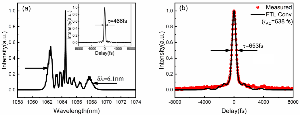 圖2 光譜展寬和脈沖壓縮結果(653 fs為自相關曲線寬度,乘以反卷積因子0.73為實際脈沖寬度)